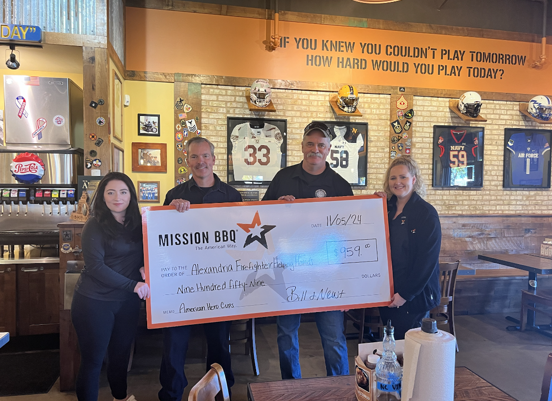 Our community partners at Mission BBQ-Kingstowne have once again so very generously supported Alexandria Firefighters Helping Hands Foundation with a donation from the sale of 9-11 cups. GM Chrissy Monk and Community ambassador Jayce Eggleston presented HHF board members Chad Lallier and Mike Chandler with a check for the foundation which allows us to continue our mission of assisting our members in times of need. We thank Mission BBQ-Kingstowne once again for their generosity and continued support of Alexandria Firefighters Helping Hands!